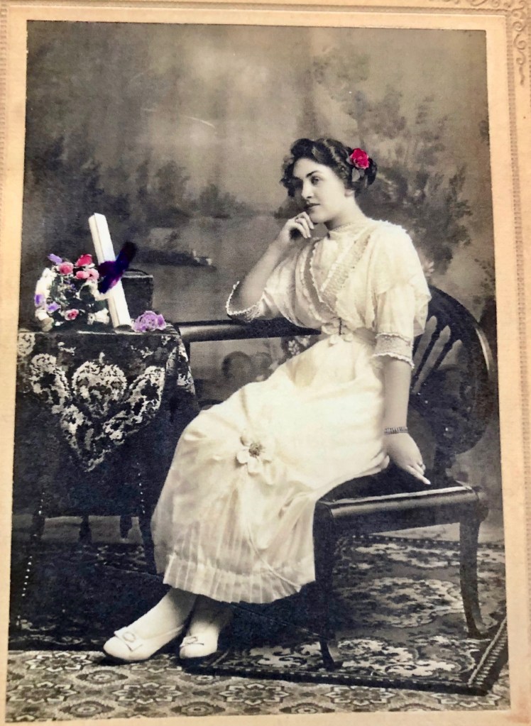 What’s this doing here? For many years, I exchanged long letters with this lady, my father’s mother. I was in California; she in Iowa, but she kept my letters and quoted me to myself in her long responses. She made reading and writing vital skills. She’d been a one-room school house teacher who rode a horse to school, tried to teach me to darn, and memorized poems, the longer and funnier, the better.